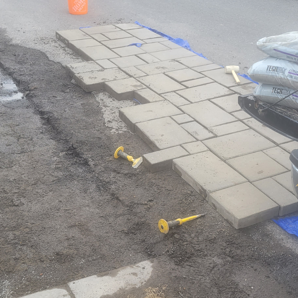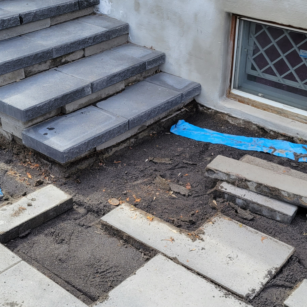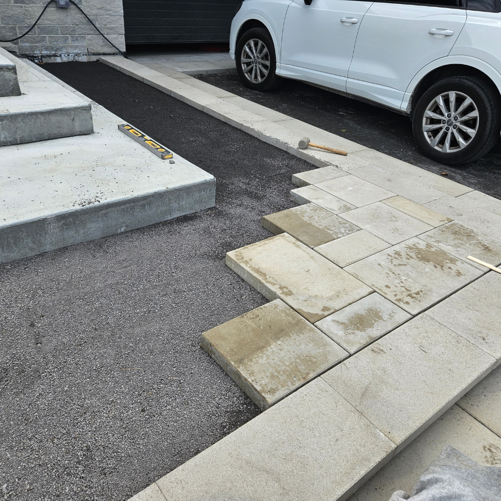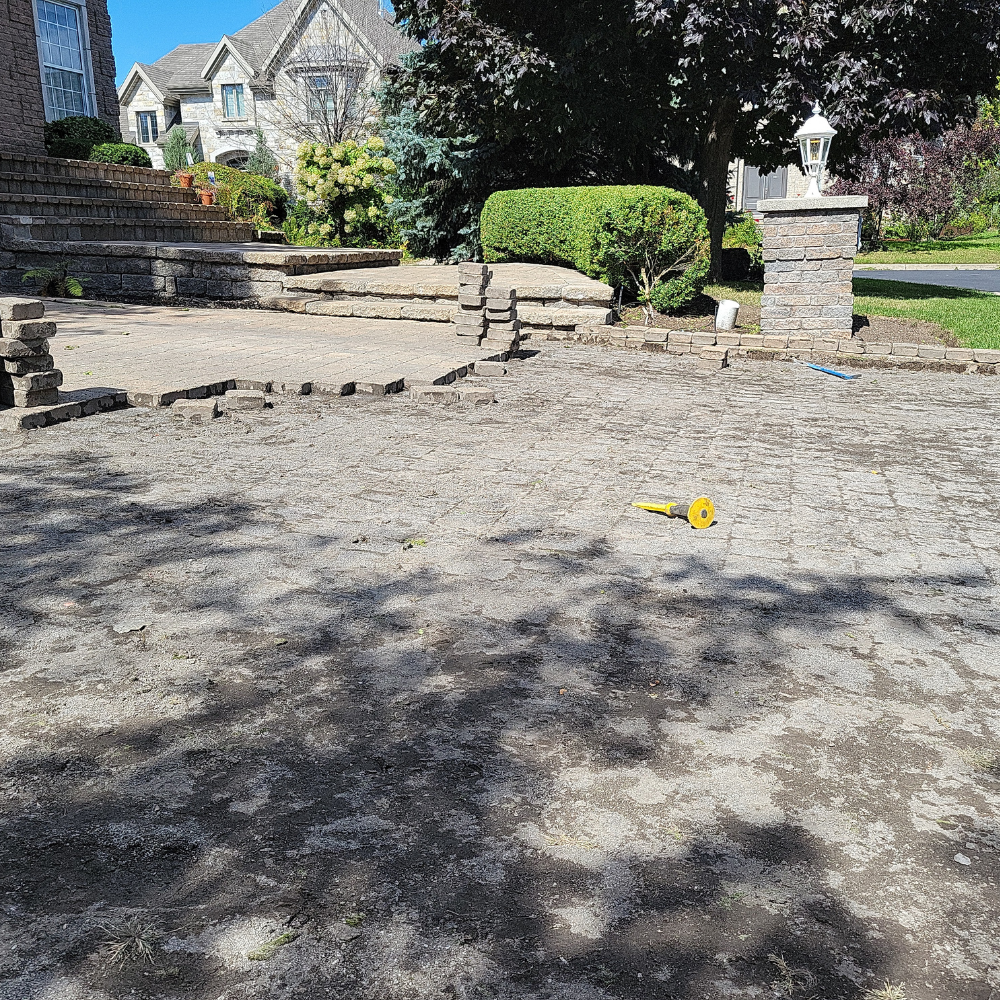 Reconstruction de la base avec poussière de pierre compactée, géotextile au besoin, puis réinstallation du pavé.