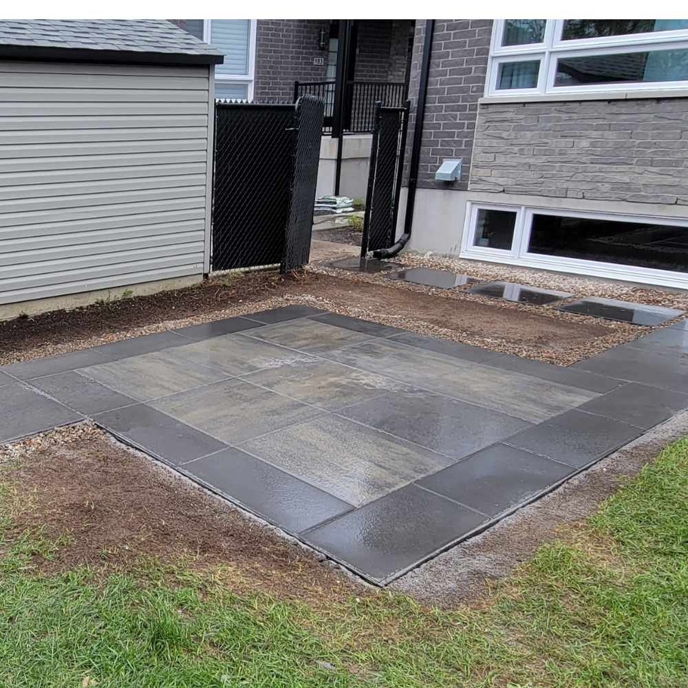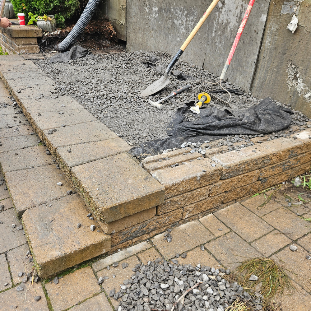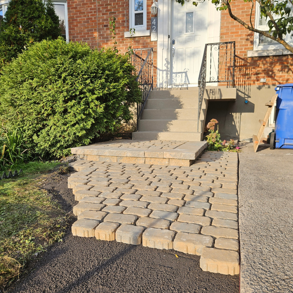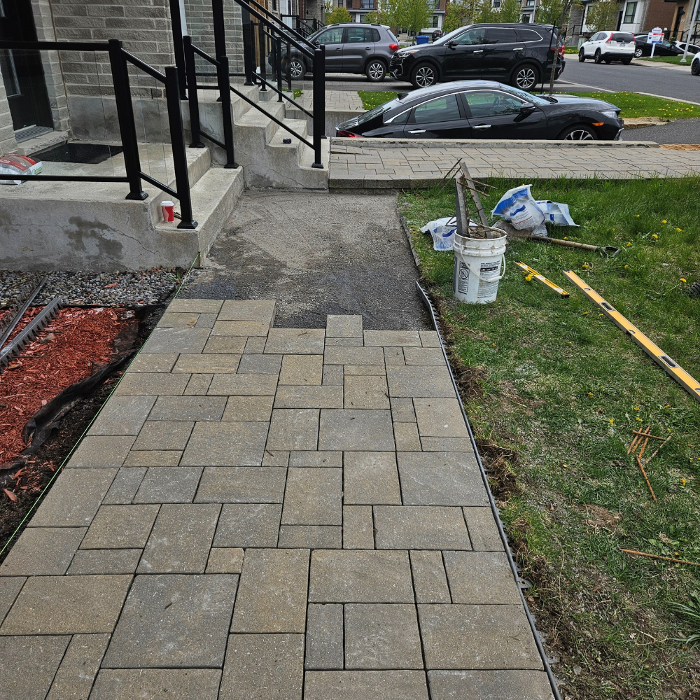 Reconstruction de la base avec poussière de pierre compactée, géotextile au besoin, puis réinstallation du pavé.