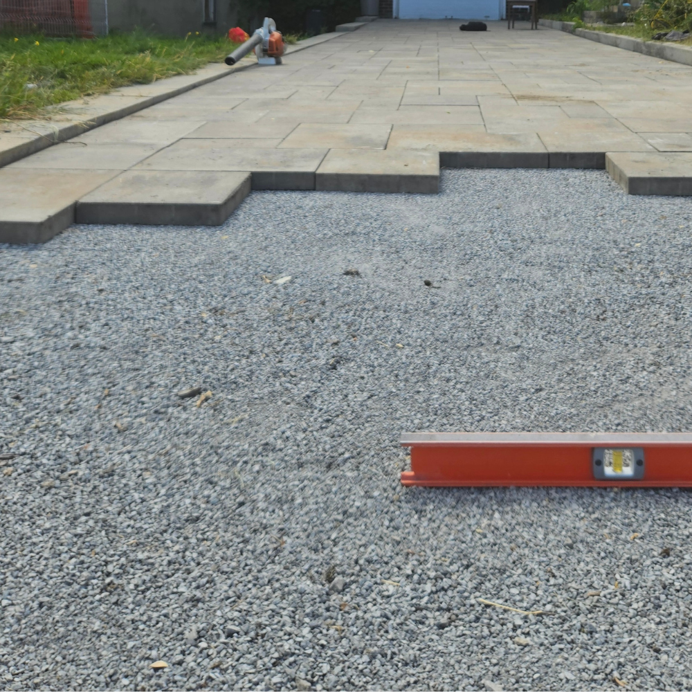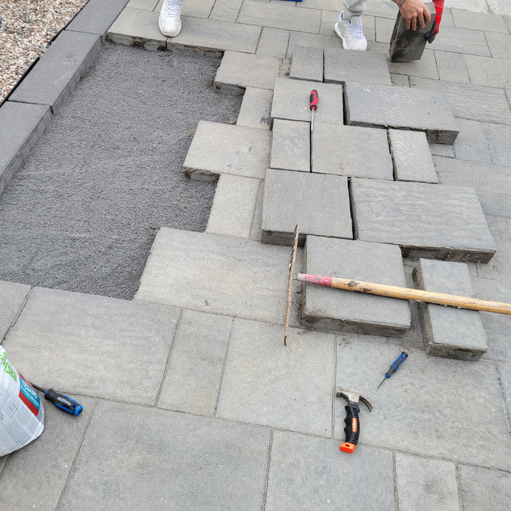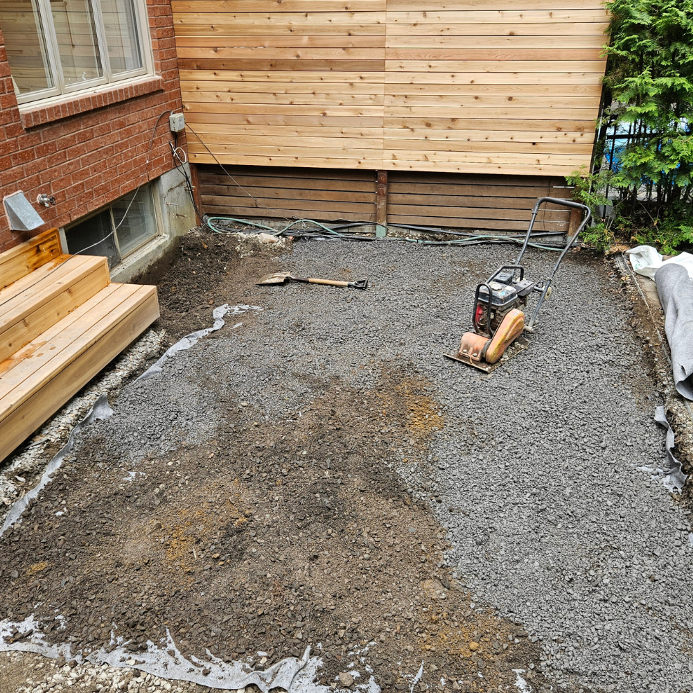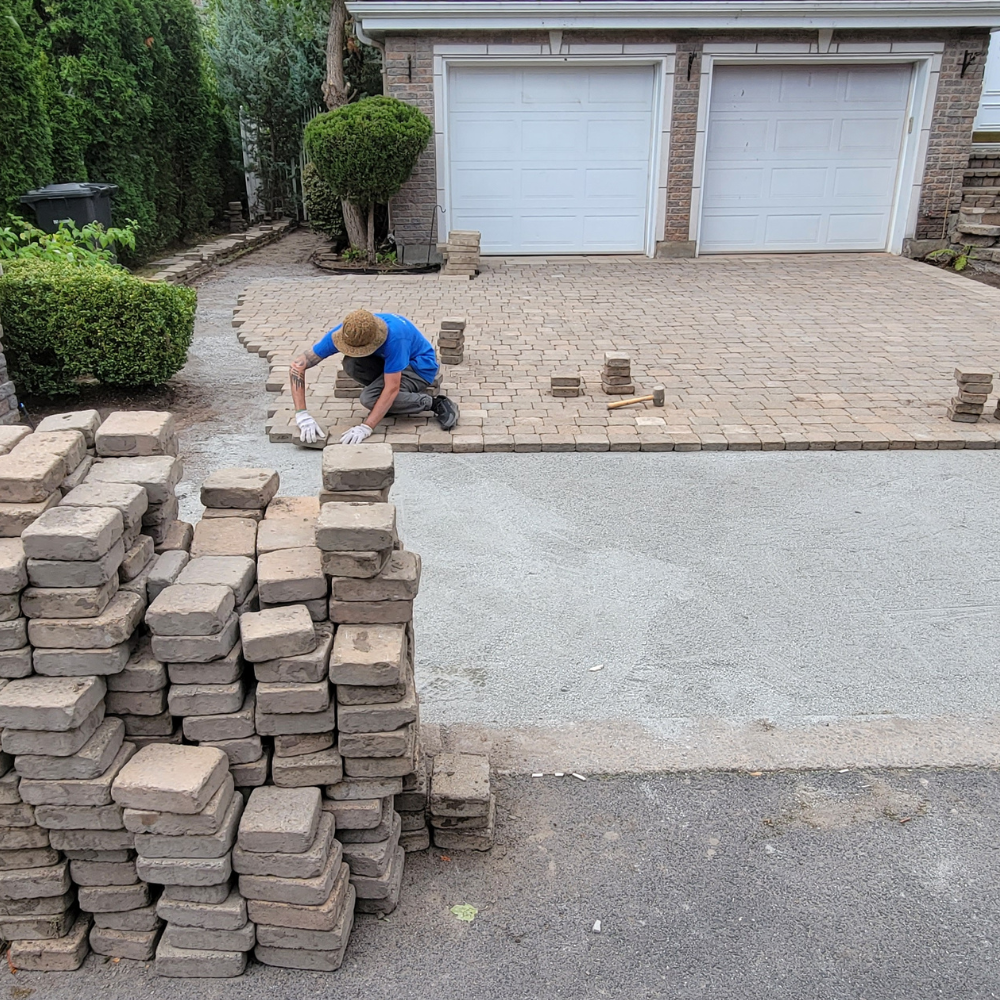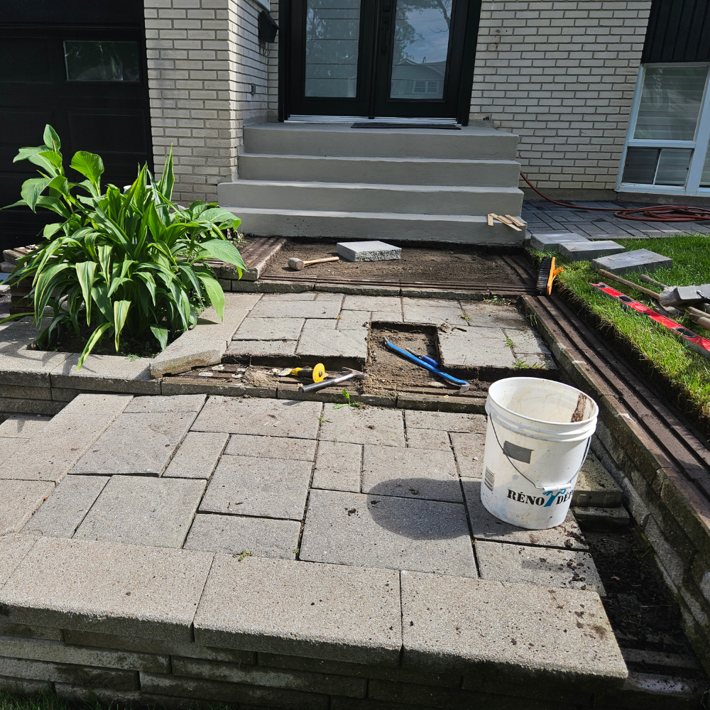 Retrait ciblé du pavé, correction de la fondation et nivelage précis.